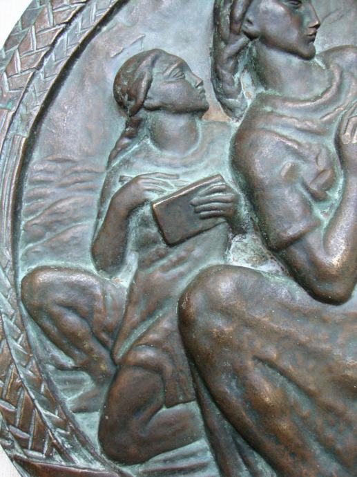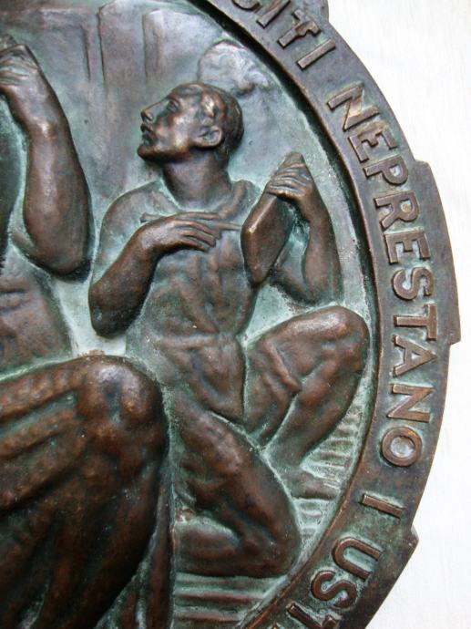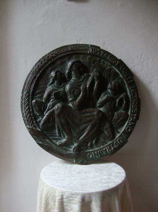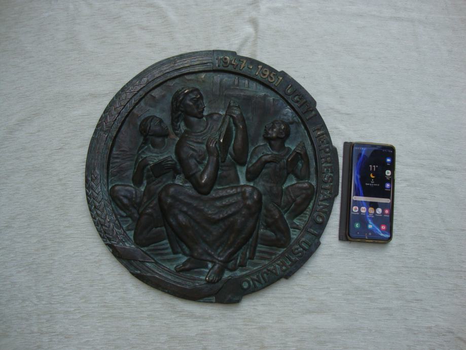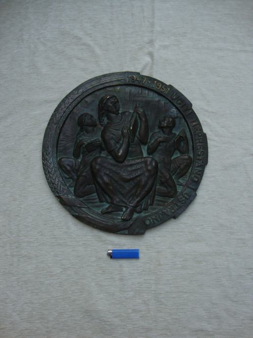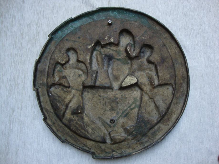 promjer 42 cm, težina 8 kg ,izljev u bronci Jugoslavenska akademija umjetnosti u Zagrebu - ,moguće meni bar slići na I.Meštović potrebna strucna procijena ,nema potpisa jer su u tom periodu bili zabranjeni od starne vladajućih