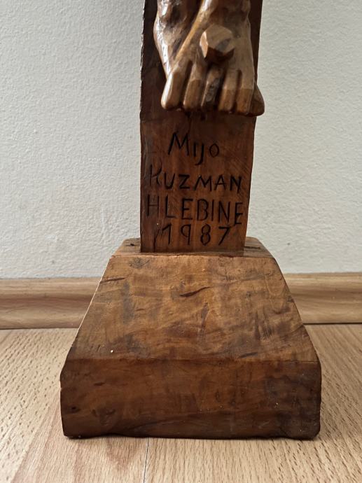 O UMJETNIKU: Mijo Kuzman rođen je 1910. godine u Hlebinama, selu koje je postalo sinonim za naivnu umjetnost u Hrvatskoj. Bio je samouki kipar i slikar, aktivan član Hlebinske škole, koji je svoj umjetnički izraz nalazio ponajprije u drvetu. Njegove skulpture odišu iskrenošću, emocionalnom snagom i tradicionalnim duhom podravskog kraja. Tijekom svog dugog života stvarao je djela prožete religioznim i narodnim motivima, a upravo ova skulptura Isusa na križu predstavlja jedno od takvih autentičnih i dirljivih ostvarenja.