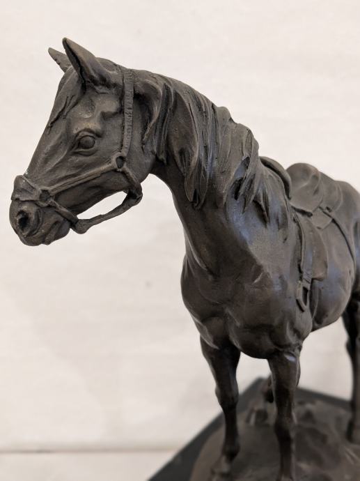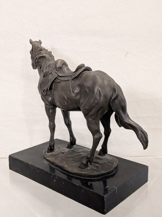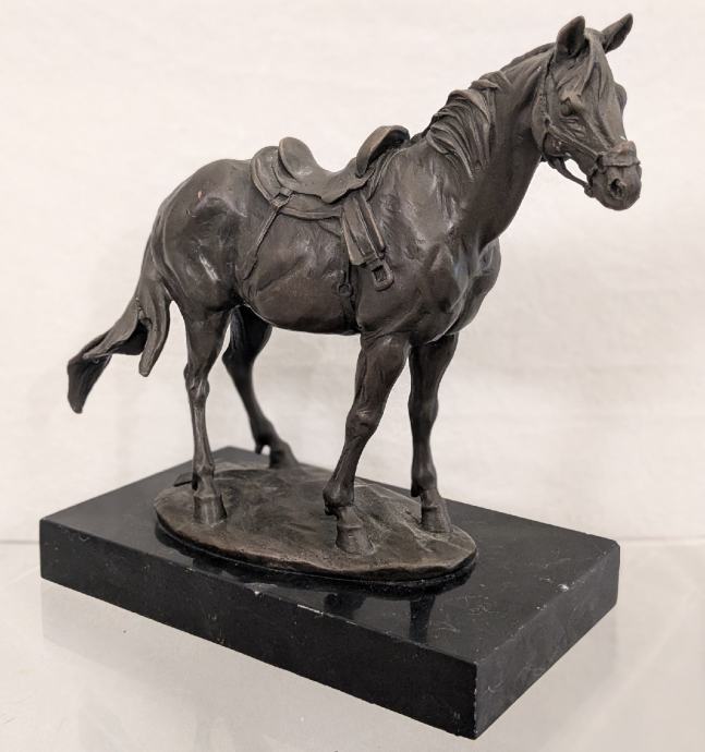 Brončani kip konja, stojeći mirno na postolju od crnog mramora. Konj ima sedlo i uzde, a rep mu je blago podignut.
