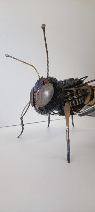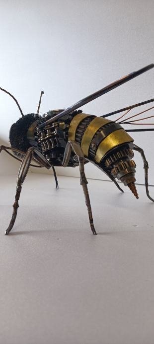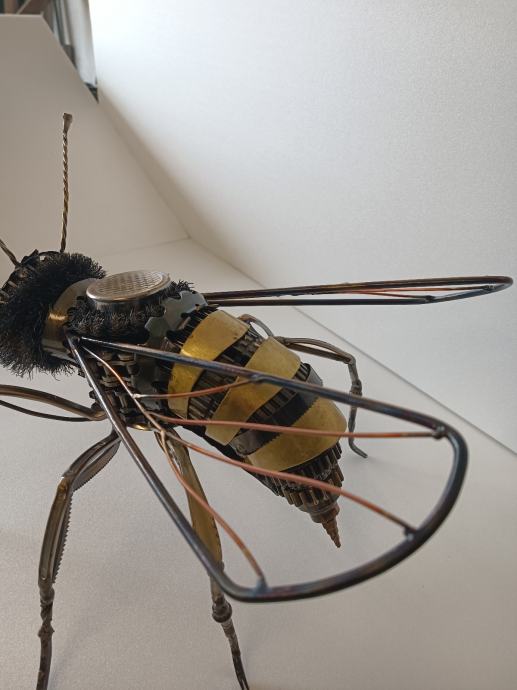 Unikatan rad. Napravljena od raznih metalnih dijelova kao što su lanci, zupčanici, stari ručni alat, naglašeno mesingom. Spajano varenjem. Zaštićeno bezbojnim lakom.