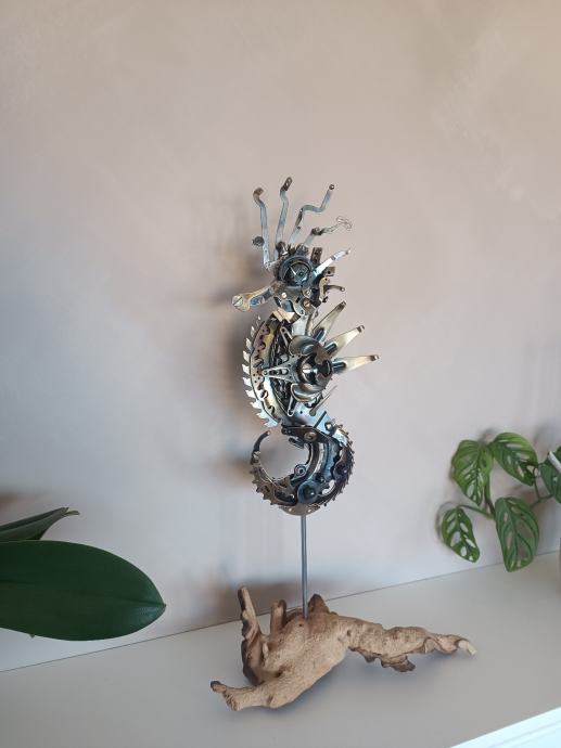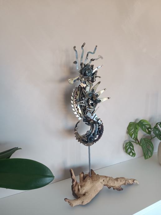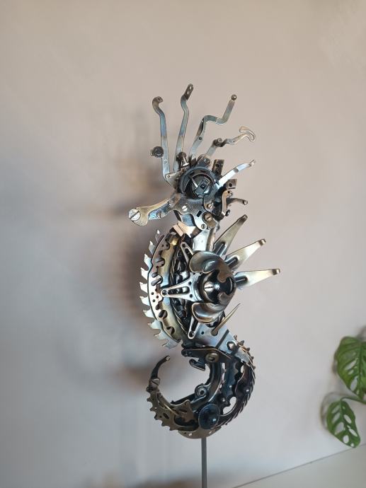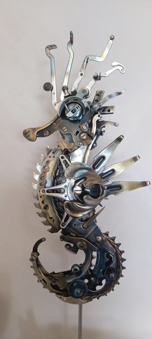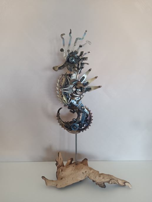 Metalna skulptura morskog konjica napravljena od raznih metalnih dijelova kao što su zupčanici, ležajevi, dijelovi bicikli, dijelovi pisaćeg i šivaćeg stroja. Spajano varenjem. Na postolju od drva mangrova.