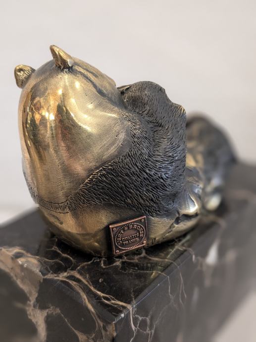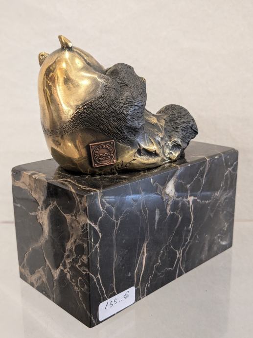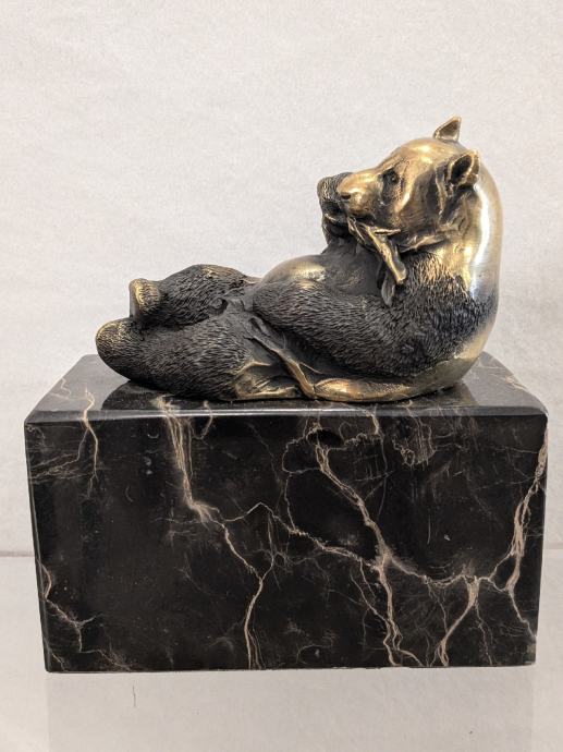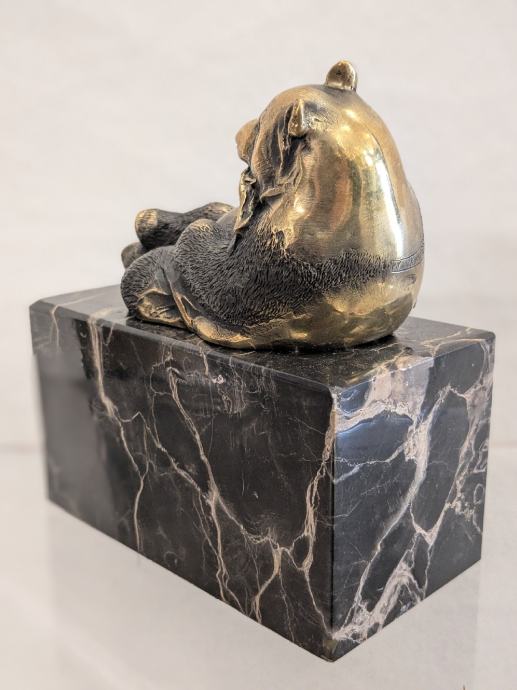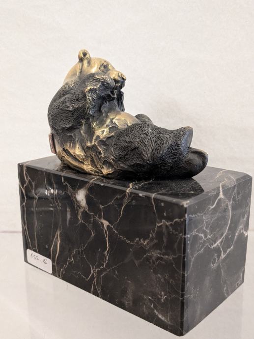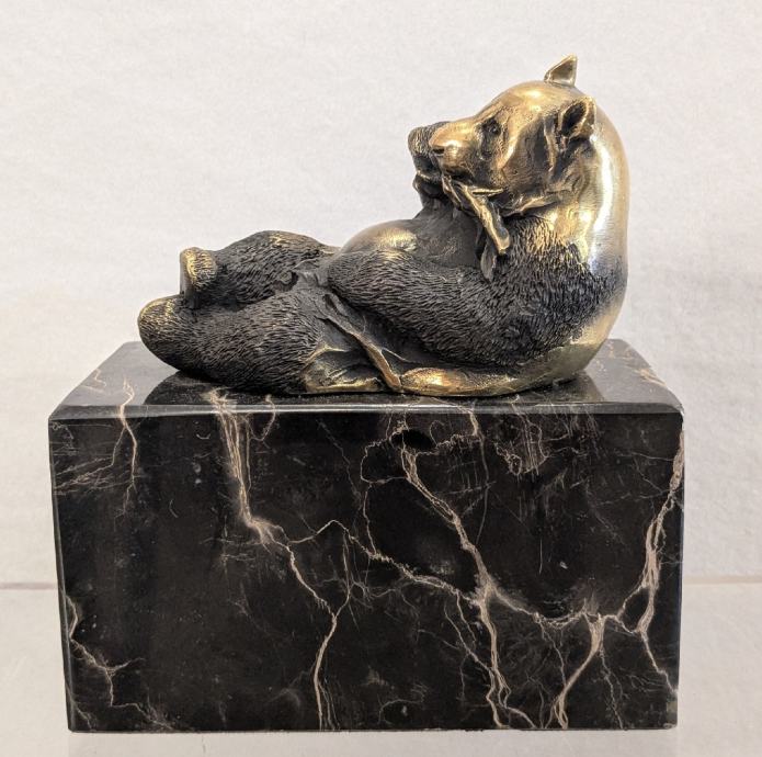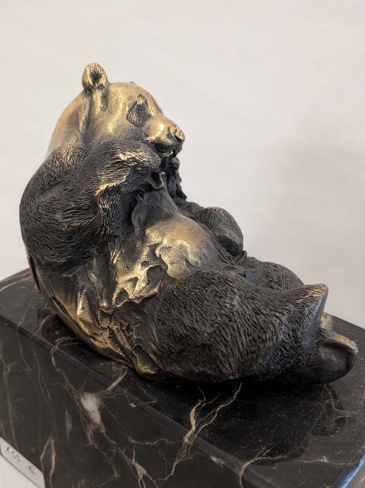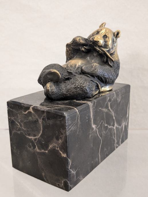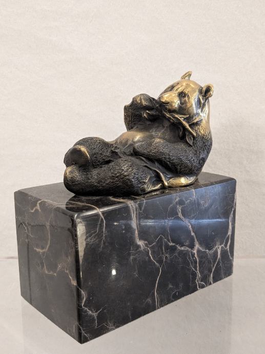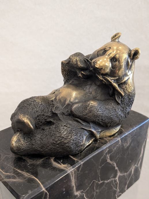 Prikaz pande kako uživa u jelu. Bronca na mramoru sa žigom o autentičnosti.
