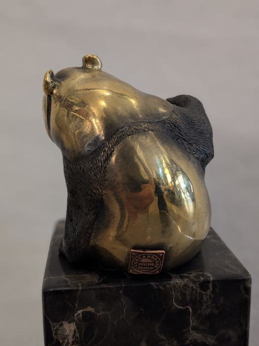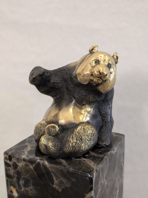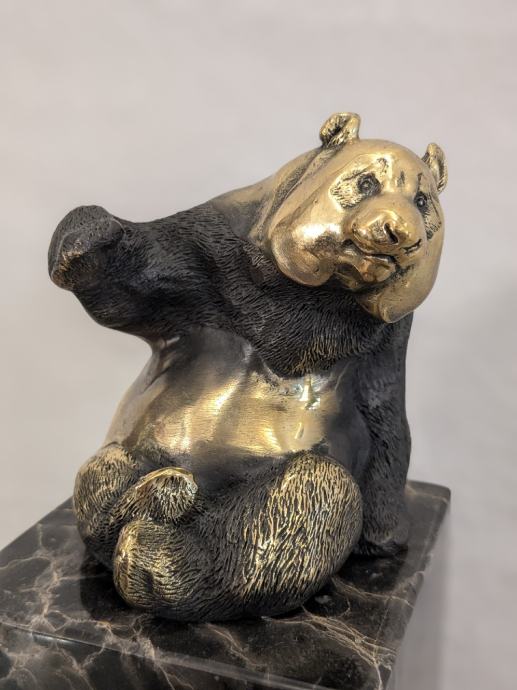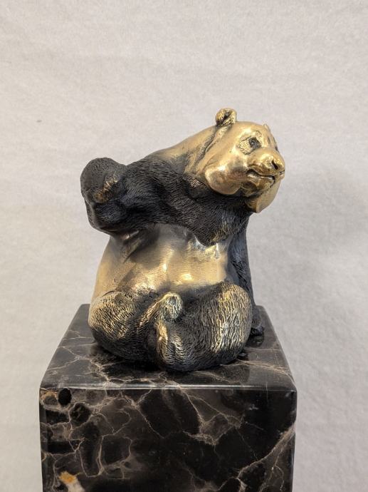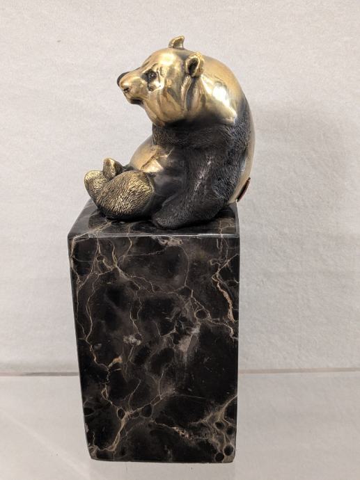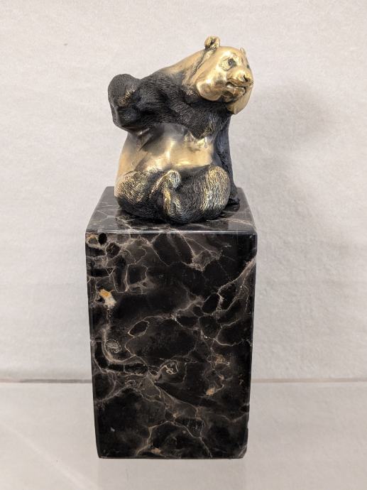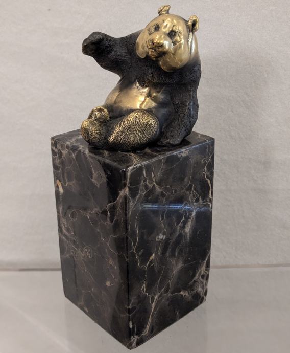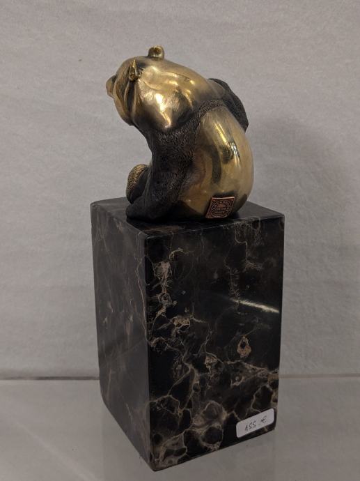 Prikaz pande u bronci na mramoru, sa žigom o autentičnosti.