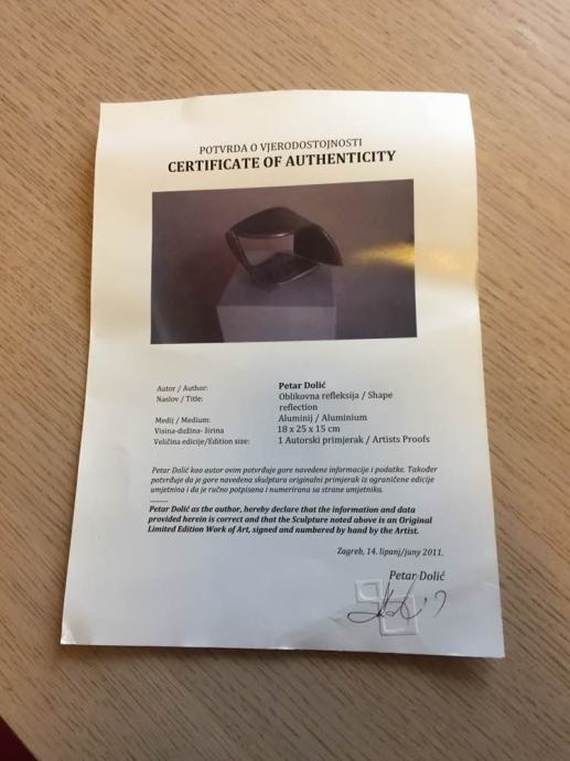 Prodajem skulpturu od Petra Dolića aluminijsku Oblikovna refleksija, 18 - 25 - 15 cm. 1 autorski primjerak!!! Ima potpisani certifikat i ostale papire šta idu uz nju!!! Cijena 1600 kuna!!! Tel 099/6545-591