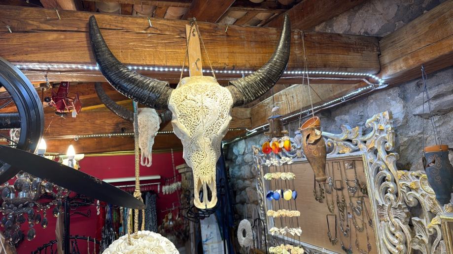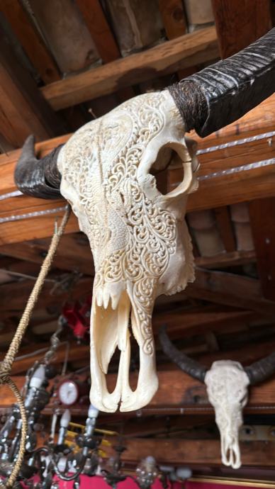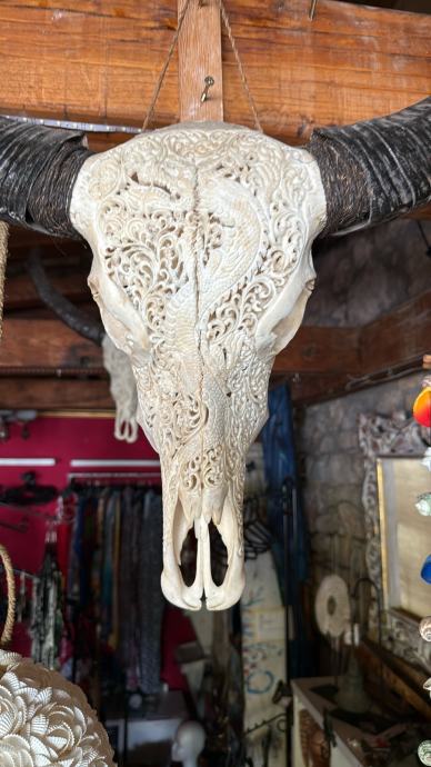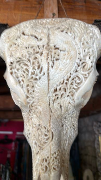 Rezbarena bikova glava, prava kost, umjetnicko djelo, dimenzije rogova 60 cm, glava 45 cm.