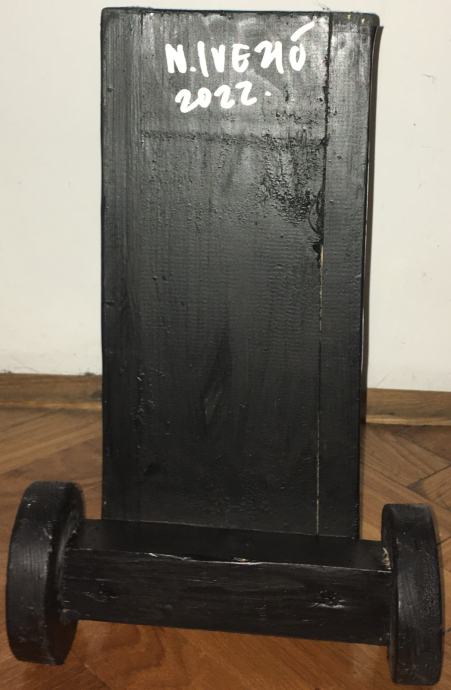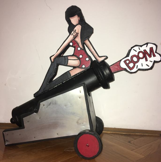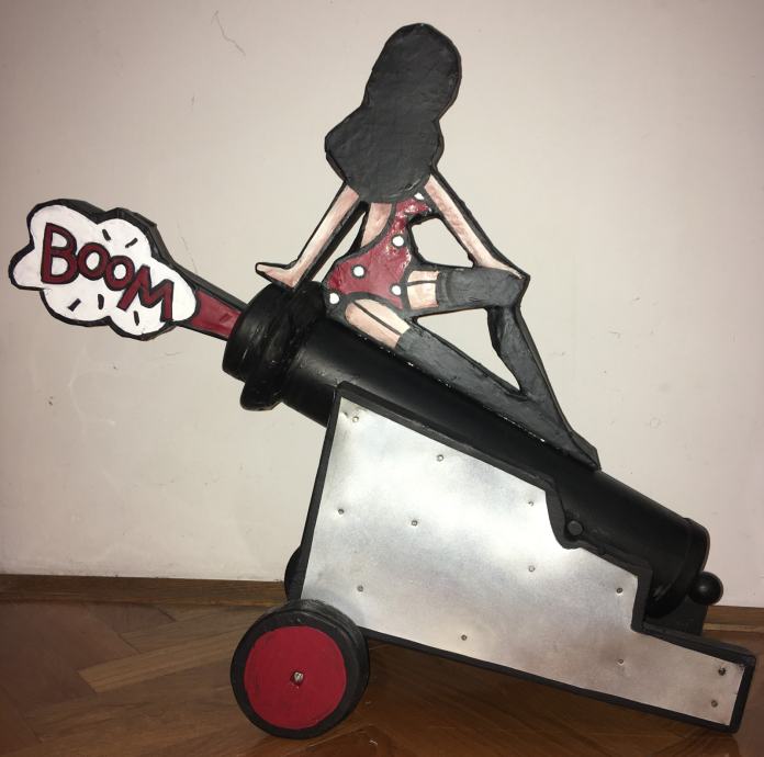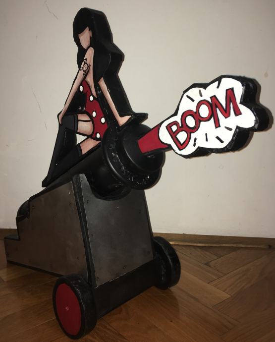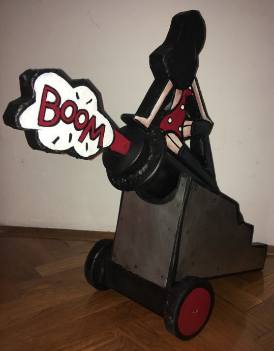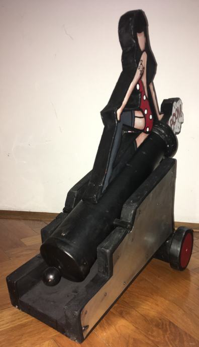 Skulptura jedne od najznačajnijih autorica suvremene hrvatske figuracije. Kombinirana tehnika (metalna cijev topa, drveno kućište, limene obloge, likovi - stirodur, boja). Dimenzije: visina 50cm, dužina 60cm, širina 21cm. Cijena je fiksna!