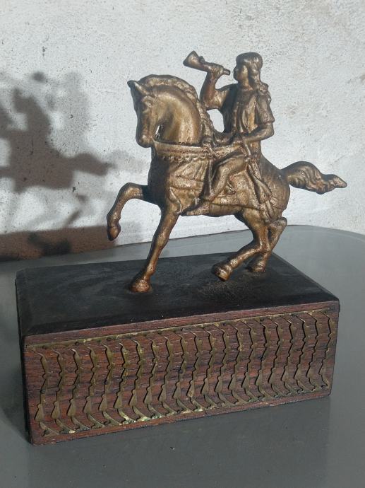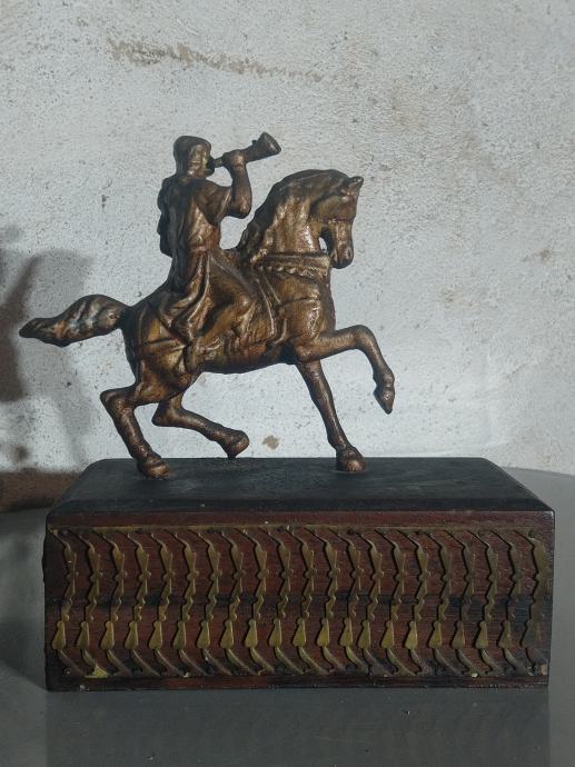 Prodajem skulpturu konjanika (odljevak) na metalnom postolju koje je ukrašeno metalnim ukrasom.
