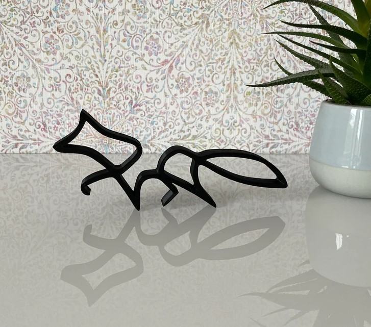 Skulptura prikazuje lisicu izrađenu u crnoj boji, oblikovanu u minimalističkom stilu. Njezino tijelo sastavljeno je od zakrivljenih i elegantnih linija koje sugeriraju pokret i gracioznost životinje. Glava je stilizirana, s jasno definiranim ušima koje pridonose prepoznatljivosti oblika. Rep je dug i zaobljen, što dodatno naglašava profinjenost forme. Unatoč jednostavnosti izvedbe, skulptura vjerno prenosi karakter i siluetu lisice, ostavljajući dojam smirenosti i promišljene elegancije.
