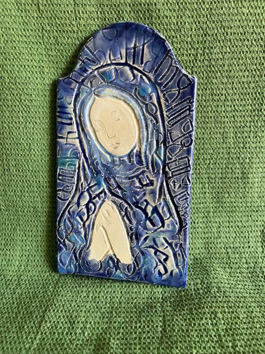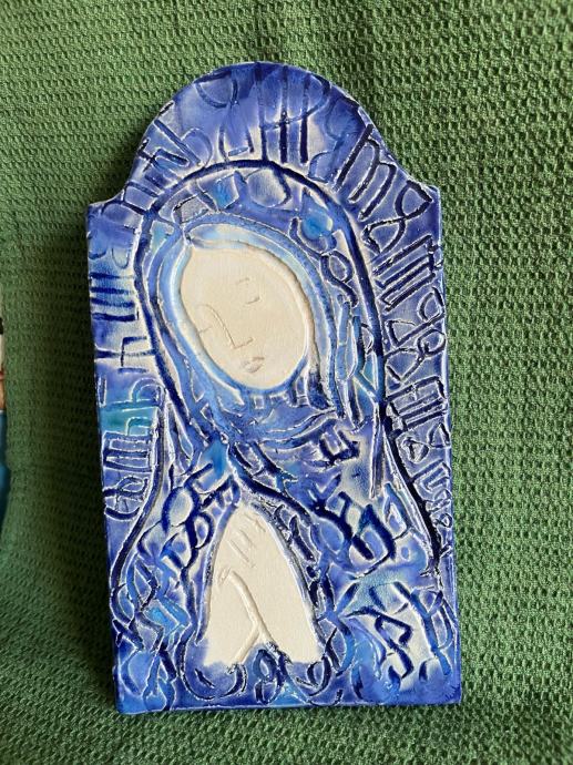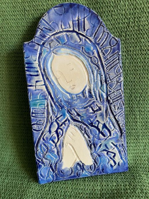 Slika reljefna , Majka božja , keramika , ručni rad, visina cca 17 cm , širina cca 10 cm. Glagoljica