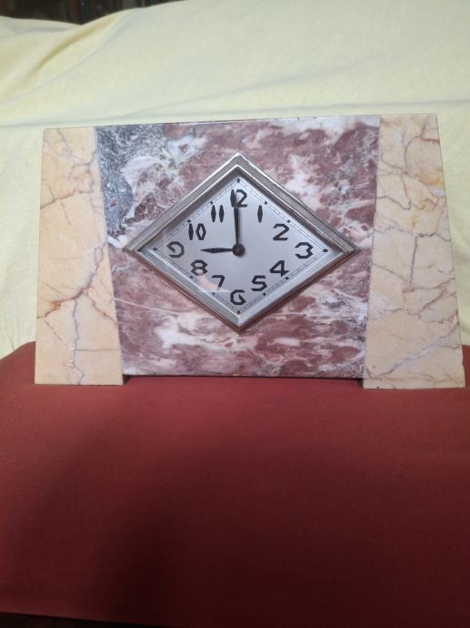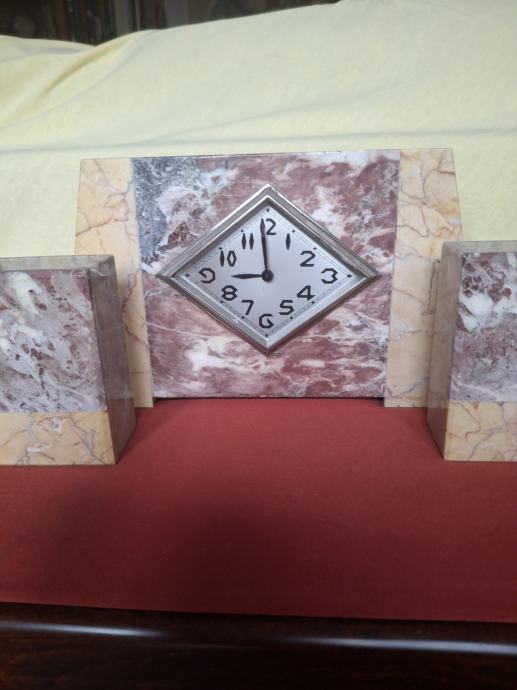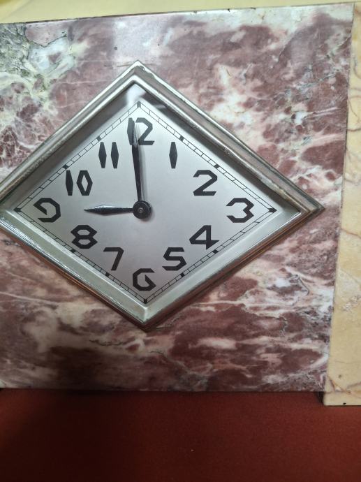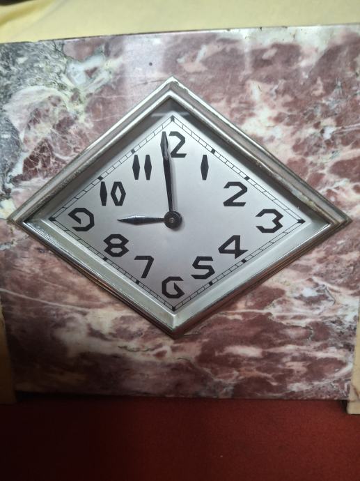 STOLNI SAT ART DECO IZ 1920-1930 god. SAT JE U MRAMORU DIMENZIJE DUŽINE 33 VISINA 19 ŠIRINE 9,5 cm SA DVA PRAVOKUTNA MRAMORA DIMENZIJE D 8,5 V 13 Š 6 cm.