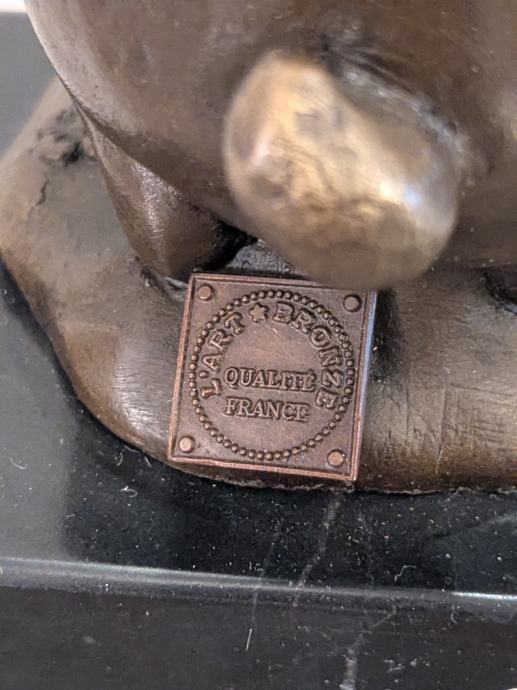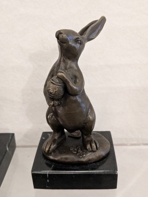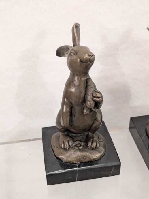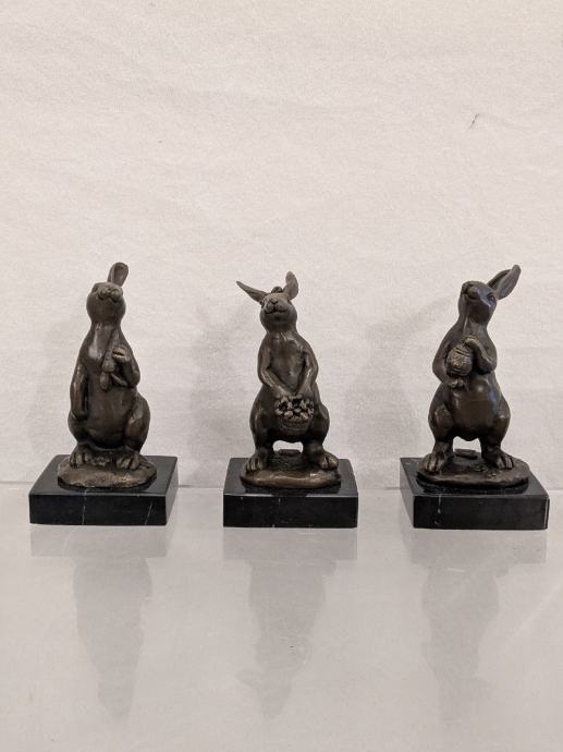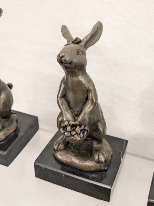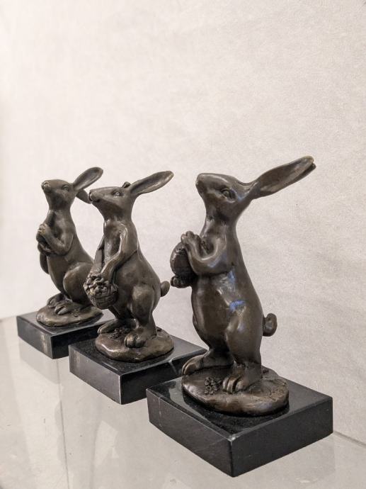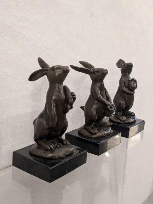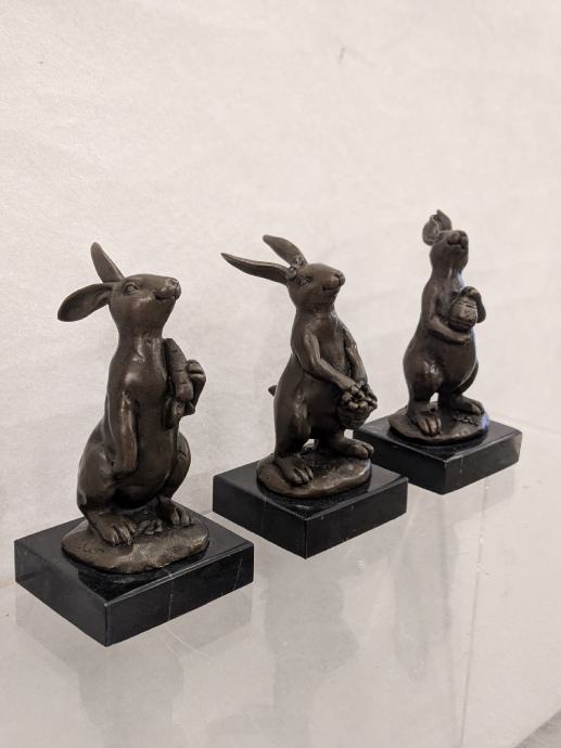 Tri brončane figure koje prikazuju zečeve koji drže mrkvu, buket, i uskršnje jaje.