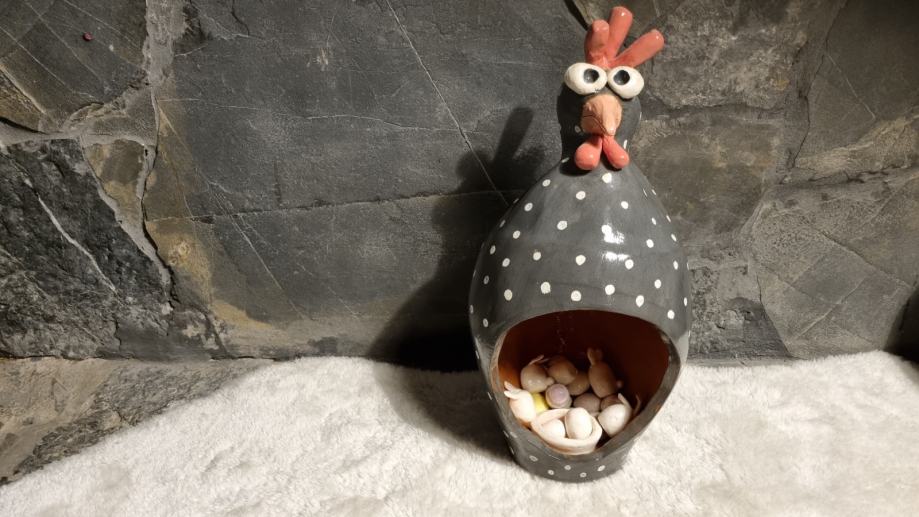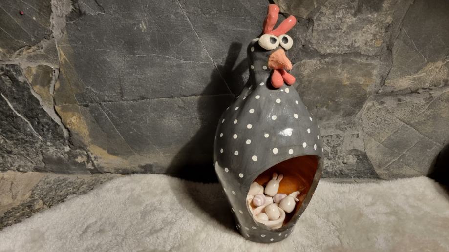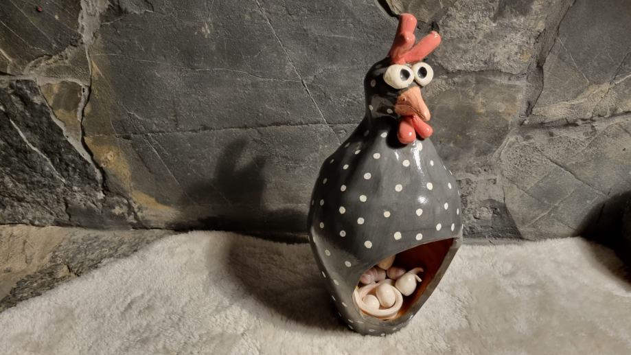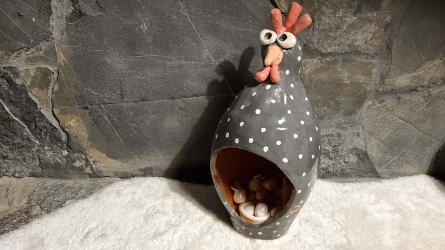 Kokoš za uskršnja jaja napravljena od keramike, terakota oslikana engobama, glazirana keramika.