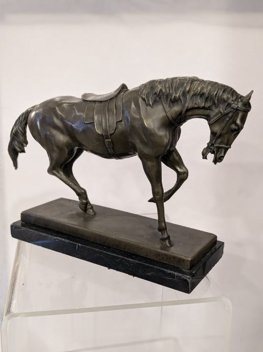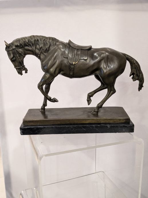 Veliki brončani konj na crnom mramoru. Mramor ima par manjih oštećenja.