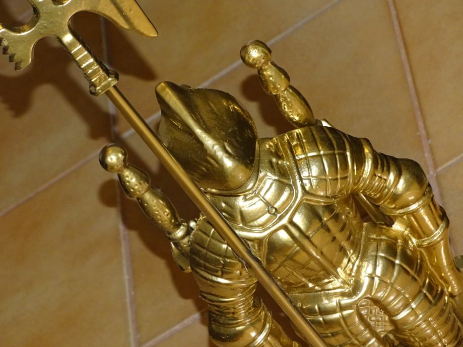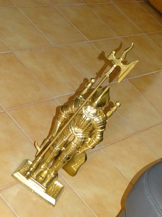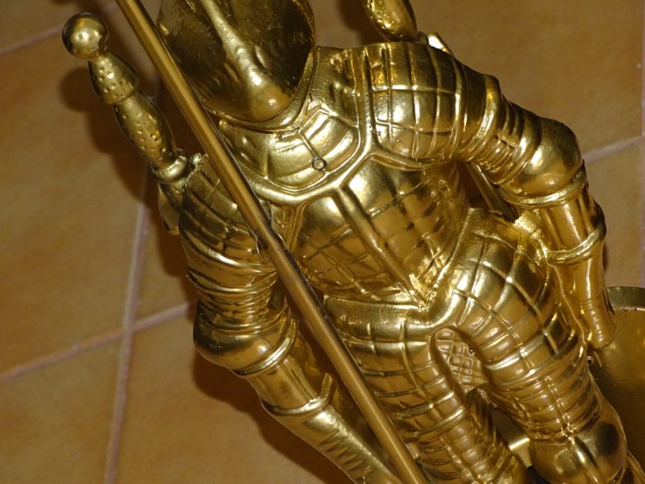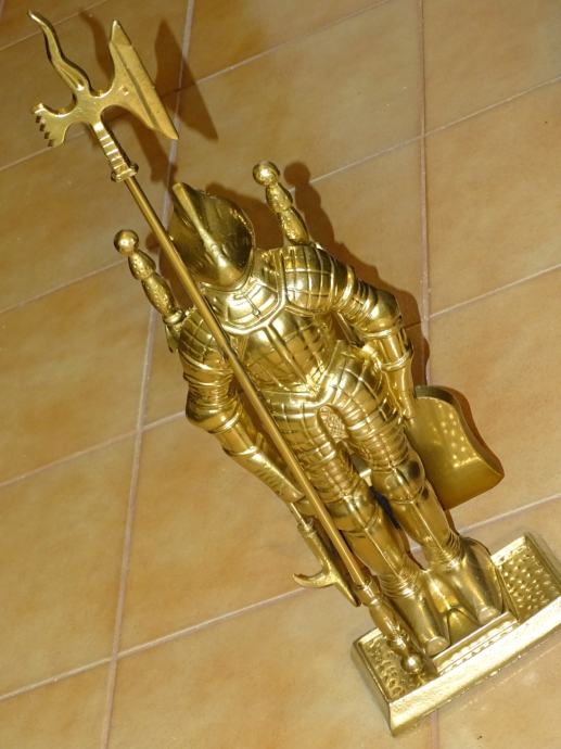 POTPUNO NOV metalni vitez (gold) u čijoj pozadini se nalaze sredstva za čišćenje kamina.