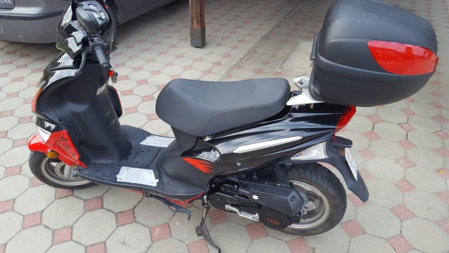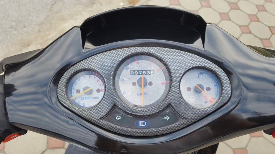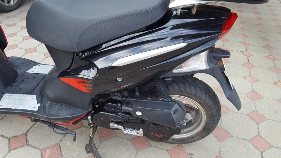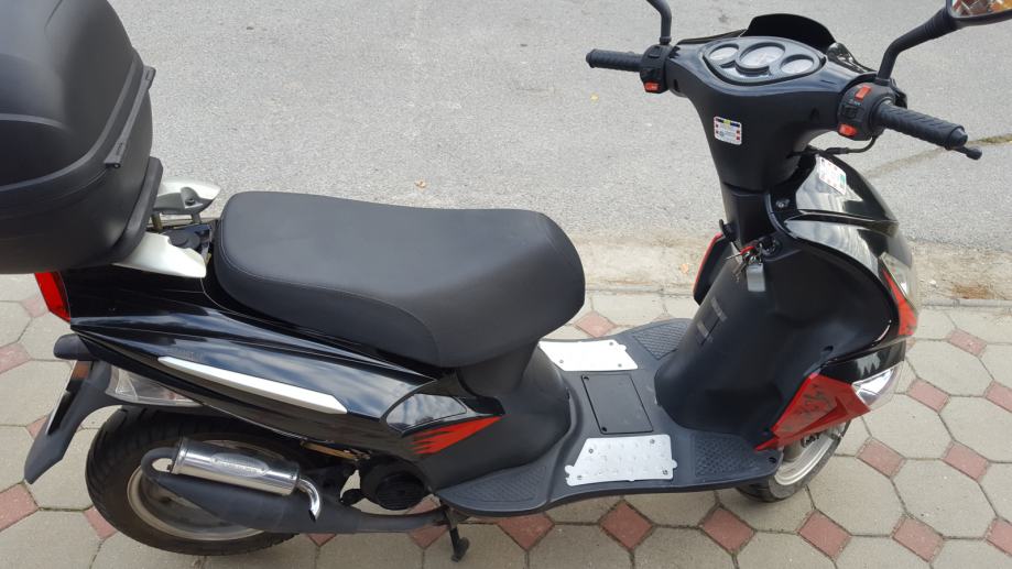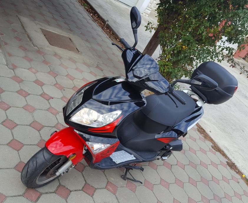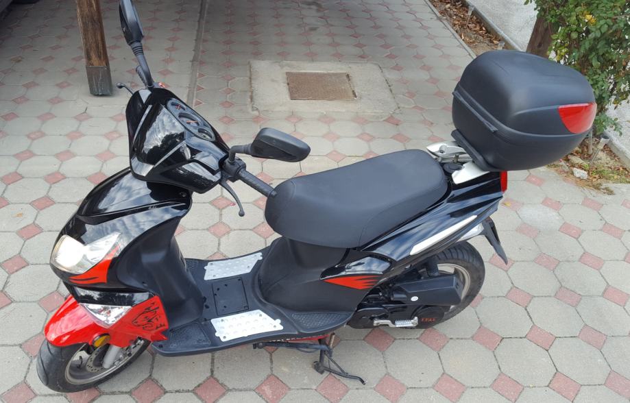 Prije nego što sam ja kupio skuter je ugrađen je KIT od 80ccm, bez obzira na ovo skuter možete voziti sa B kategorijom. Ugrađena je i elektronska blokada tako da skuter može maksimalno ići 75km/h. Dodatak je i kovčeg za kacigu (ne znam od koliko je litara) no stane kaciga i još malo sa stvari sa strane. Plaćen 600kn, no on je u cijeni skutera (3500kn).