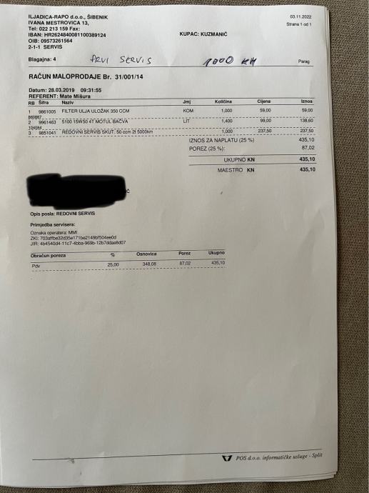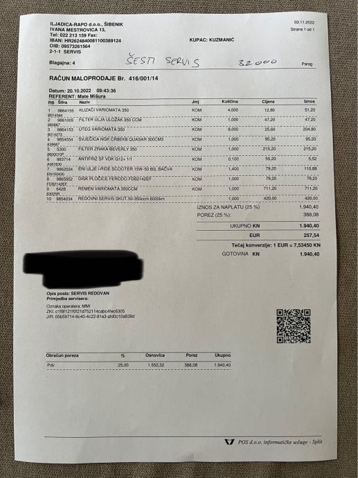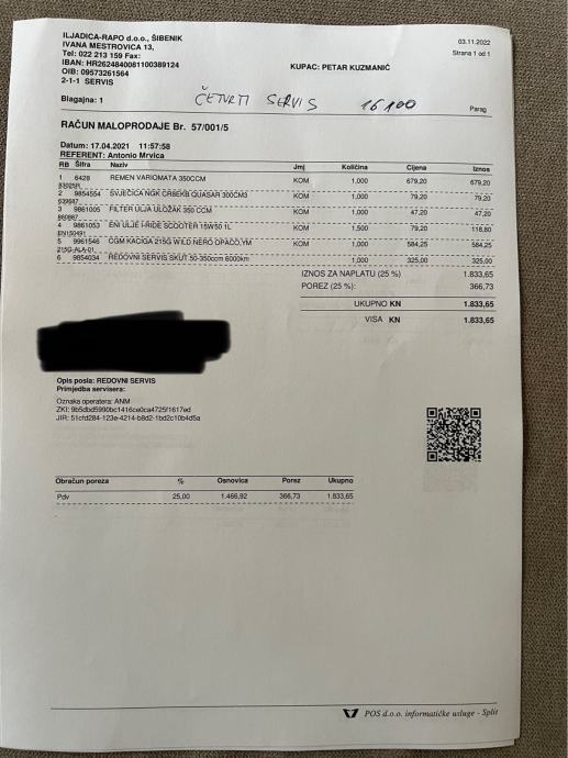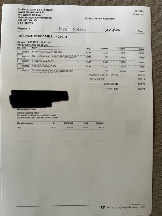 Na zadnjem servisu (veliki servis) prominjeni svi filteri, remen, klizači i utezi variomata, zadnje pločice, gume (michelin city grip 2), ulje.