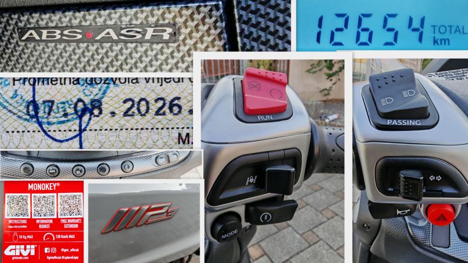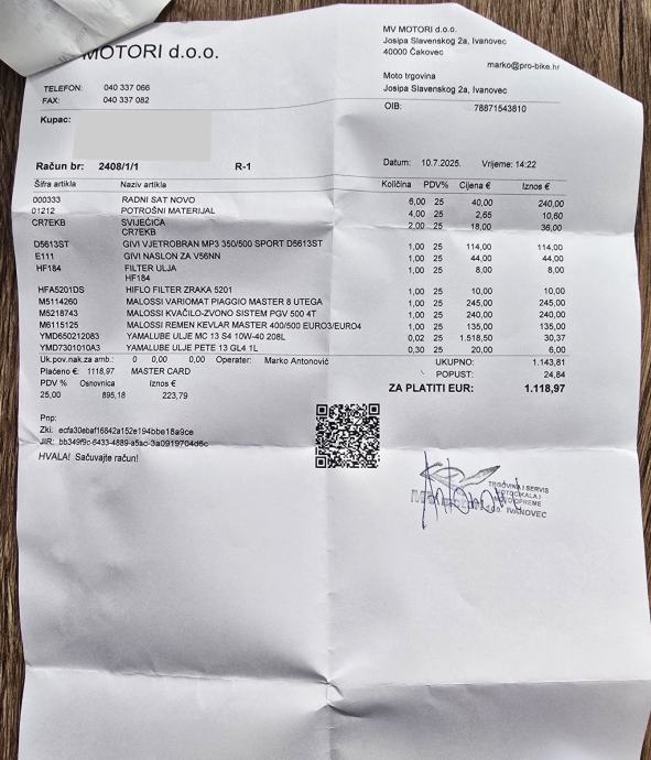 Dana 10.07.2025 na 11.900km napravljen je kompletan servis zamjene ulja, svih filtera, svjećica, postavljen novi Malossi variomat Master 8 utega, Malossi set kvačila, Malossi remen kevlar Master, te je ugrađen original GIVI povišeni vjetrobran za MP3, Givi naslon za V56 sve plaćeno 1119 eura. (račun se može vidjeti na posljednjoj slici.)