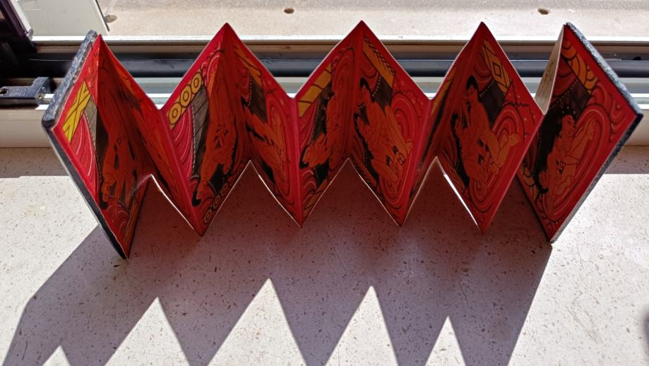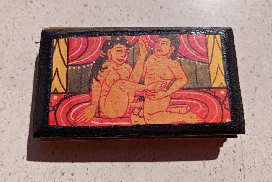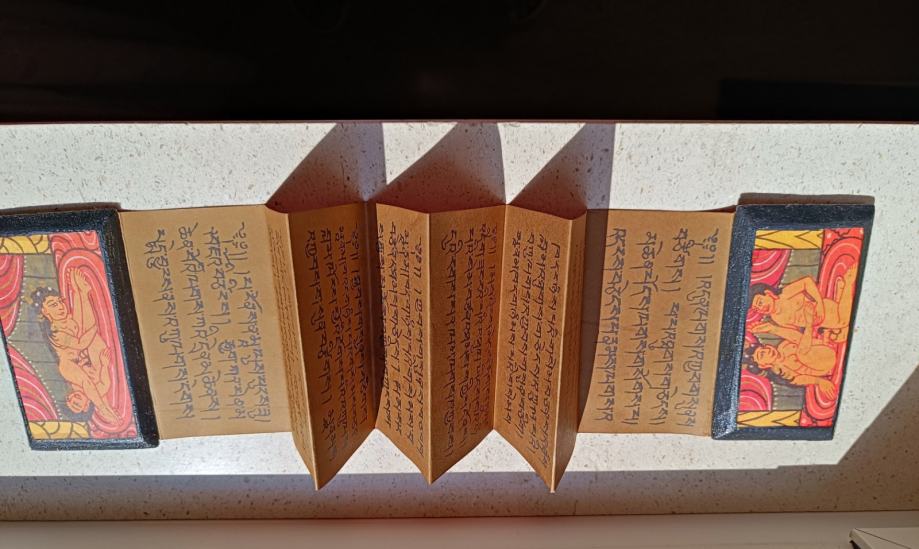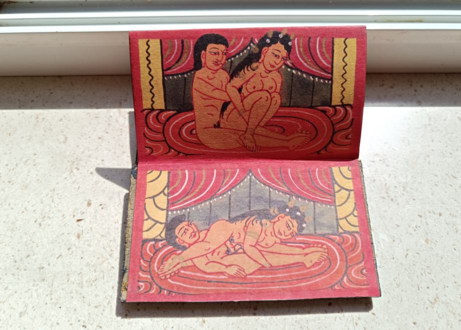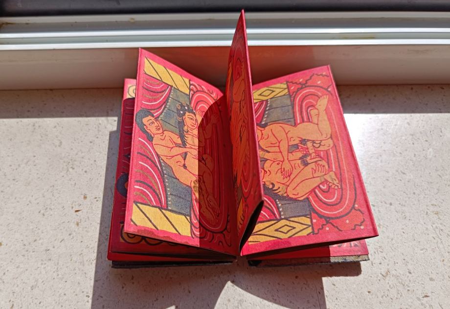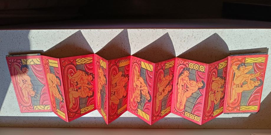 Erotski crteži sa tekstom posloženi kao mini album u stilu harmonike , sa čvrstim koricama, u tekstilnoj futroli tipično za Nepal