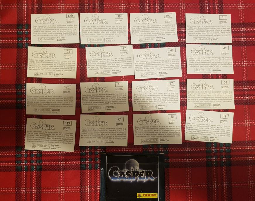 16 Panini sličica Casper 1995 i jedan otvoreni prazni paketić. Sličice su vrlo dobrom stanju, vidljivo na slikama.