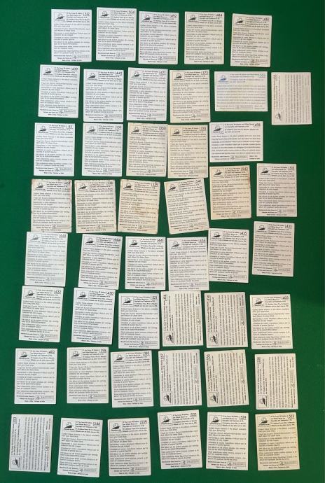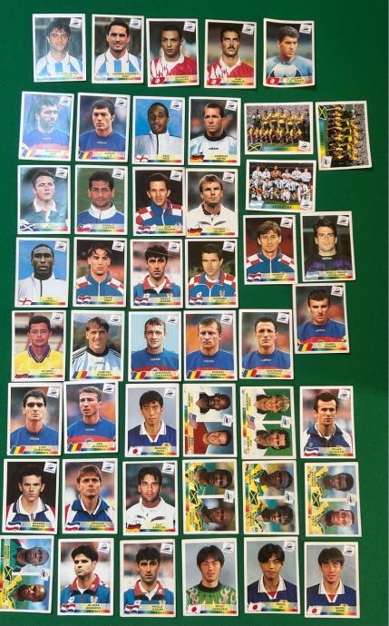 Sličice u dobrom i vrlo dobrom stanju, (kao na slikama). Sličice nisu mint, zato i je i takva cijena. Znači, nije za zahtjevne kolekcionare. 45 ih je crna pozadina + 1 plava pozadina. Samo dvije duple. Ne prodajem pojedinačno.