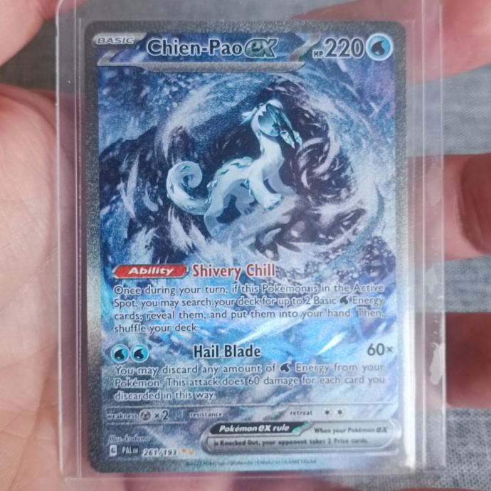 Special Illustration Rare karta Chien-Pao ex iz seta Pokemon karata Paldea Evolved. Karta je savršeno očuvana, zaštićena je u sleeve-u i toploaderu.