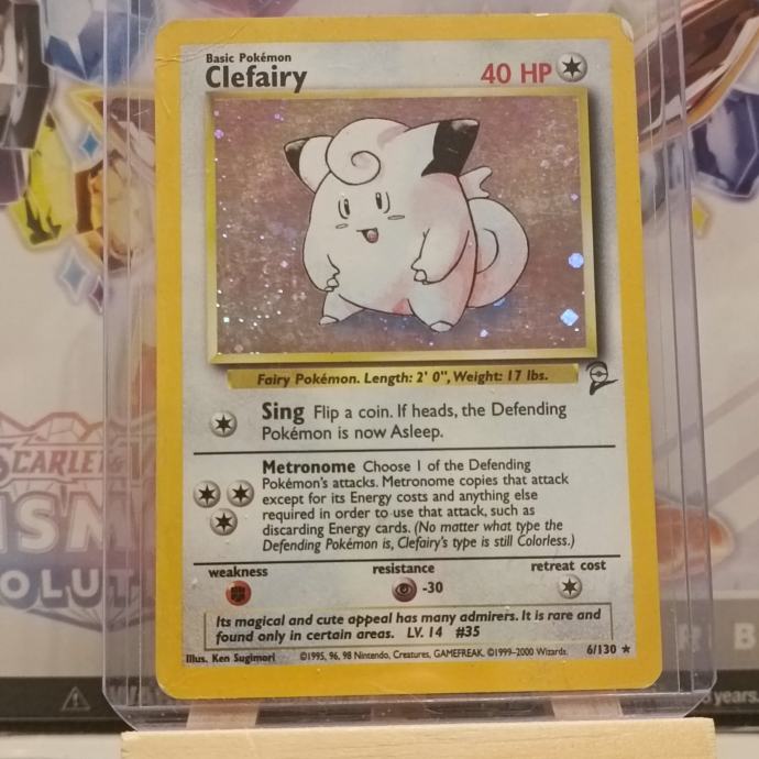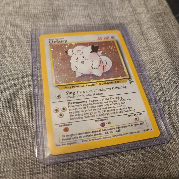 Original holo karta Clefairy iz jednog od prvih setova Pokemon karata (Base Set 2, 2000. godina). Karta ima manje tragove korištenja, ali je i dalje odlična za popunjavanje kolekcije i držanje u binderu. Holo folija je u odličnom stanju. Zaštićena je u sleeve-u i toploaderu.