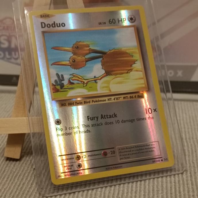 Doduo Reverse Holo Pokemon karta iz seta Evolutions iz 2016. godine, savršeno očuvana i stavljena u zaštitni sleeve i toploader. Odlična prilika za kolekcionare starijih karata.