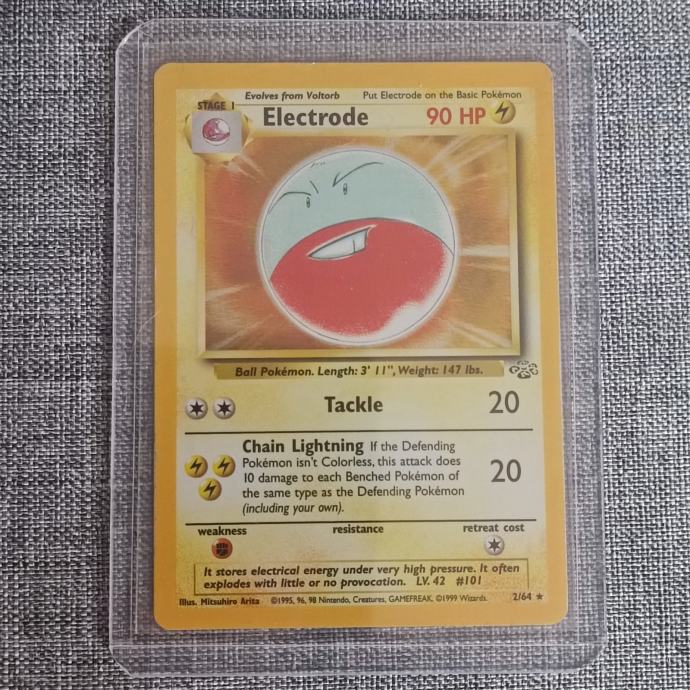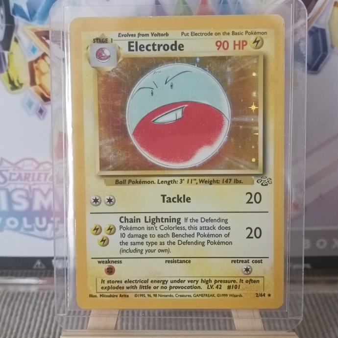 Vintage holo Pokemon karta Electrode iz jednog od prvih setova (Jungle set, 1999. godina). Karta je dobro očuvana i zaštićena u sleeve-u i toploaderu.