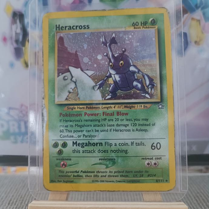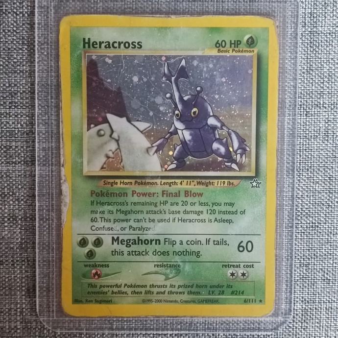 Vintage holo Pokemon karta Heracross iz jednog od prvih setova (Neo Genesis set, 2000. godina). Karta zbog starosti ima nedostatke vidljive na slikama, sad je zaštićena u sleeve-u i toploaderu.
