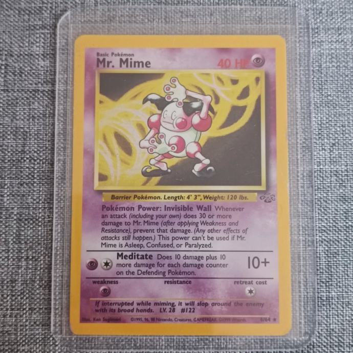 Vintage holo Pokemon karta Mr. Mime iz jednog od prvih setova (Jungle set, 1999. godina). Karta je zaštićena u sleeve-u i toploaderu.