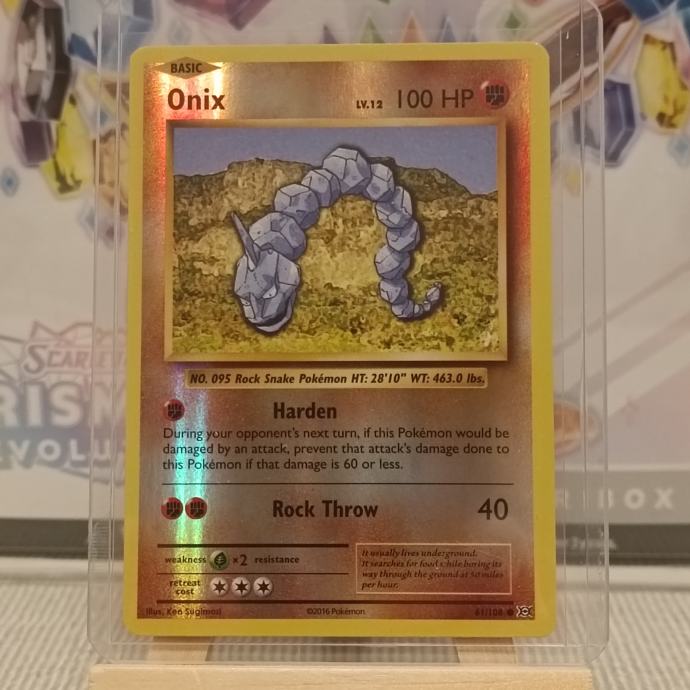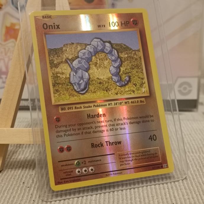 Onix Reverse Holo Pokemon karta iz seta Evolutions iz 2016. godine, savršeno očuvana i stavljena u zaštitni sleeve i toploader. Odlična prilika za kolekcionare starijih karata.