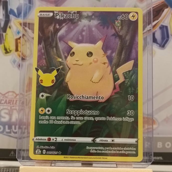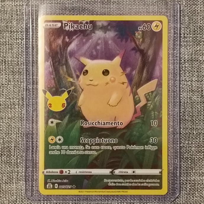 Original Holo Rare Pikachu karta iz Celebrations seta iz 2021. godine. Karta je u NM stanju, na talijanskom jeziku, odmah je zaštićena sleeve-om i stavljena u toploader.