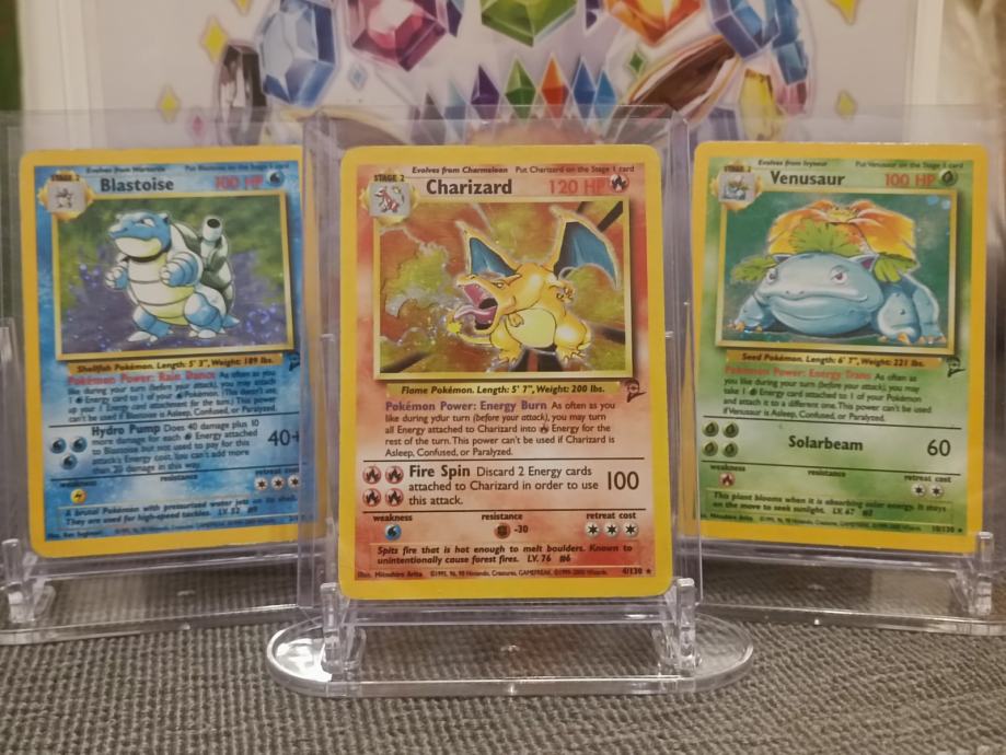 Prodajem original vintage holo Pokemon karte Charizard + Blastoise + Venusaur iz Base Set 2 (2000. godina), isključivo kao set.