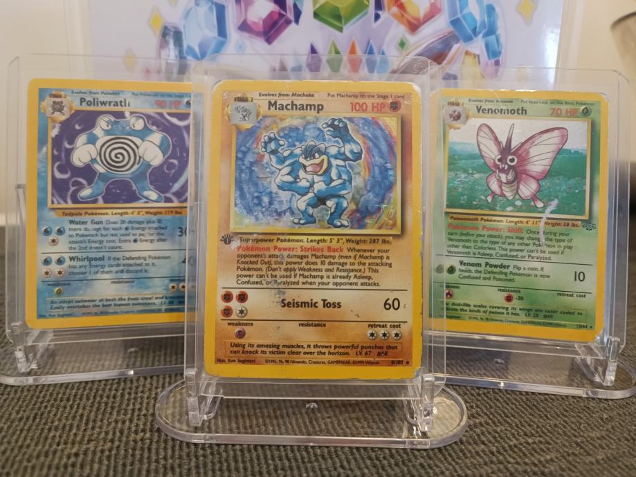 Prodajem Pokemon vintage holo lot – 3 originalne holo karte: Machamp (Base Set, 1st Edition), Poliwrath (Base Set), Venomoth (Jungle). Karte su iz 1999. godine.