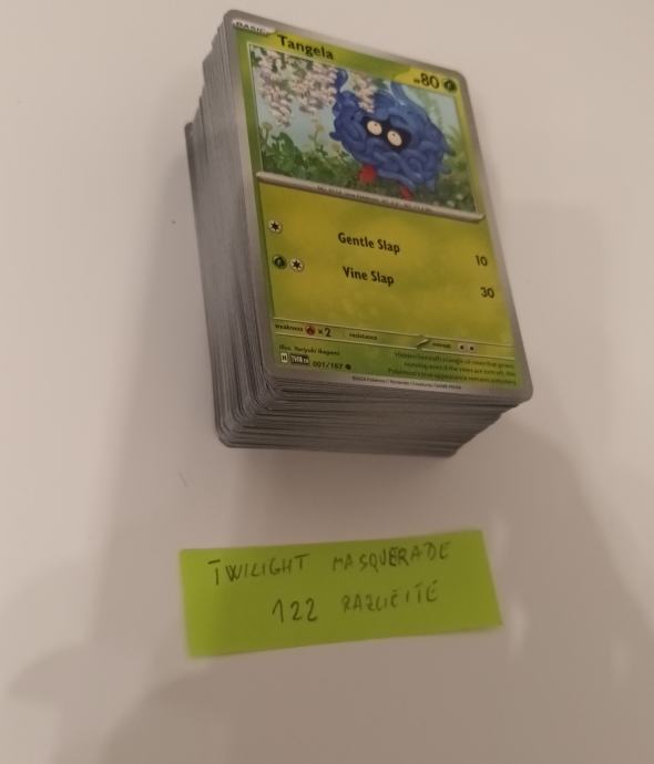 122 različite karte iz seta Pokemon Twilight Masquerade. Nema holo, reverse ni ex karti unutra.
