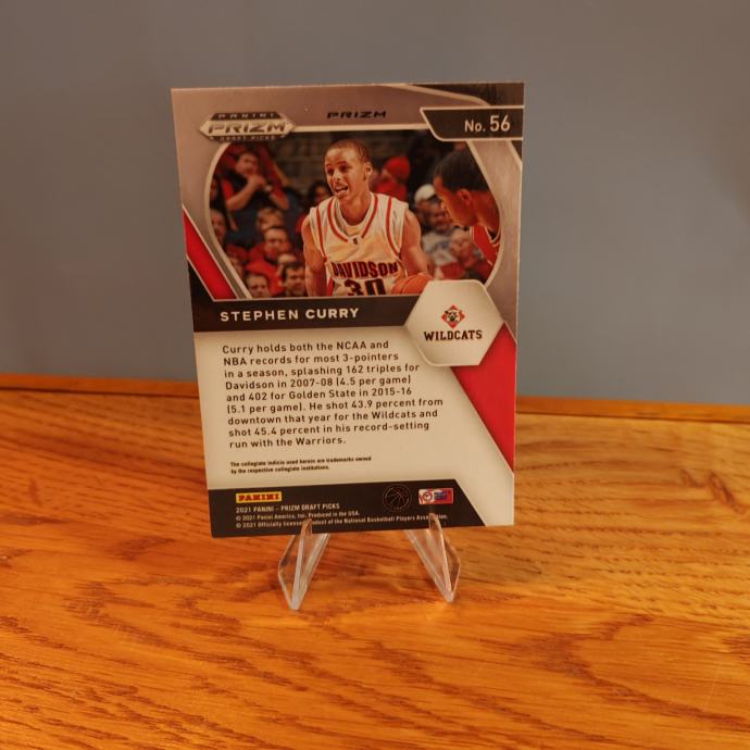 Iako je izdana 2021. godine, ova kartica majstorski dočarava Curryjeve formativne godine na Davidson Collegeu, gdje je postavio temelje za revolucionarnu karijeru koja će zauvijek promijeniti igru. Kartica bilježi energiju i dinamiku Curryja u punoj akciji, noseći legendarni dres Davidson Wildcatsa s brojem 30.