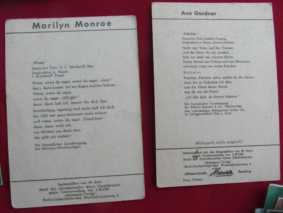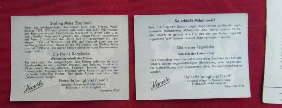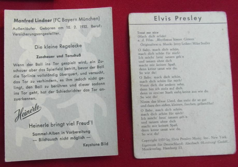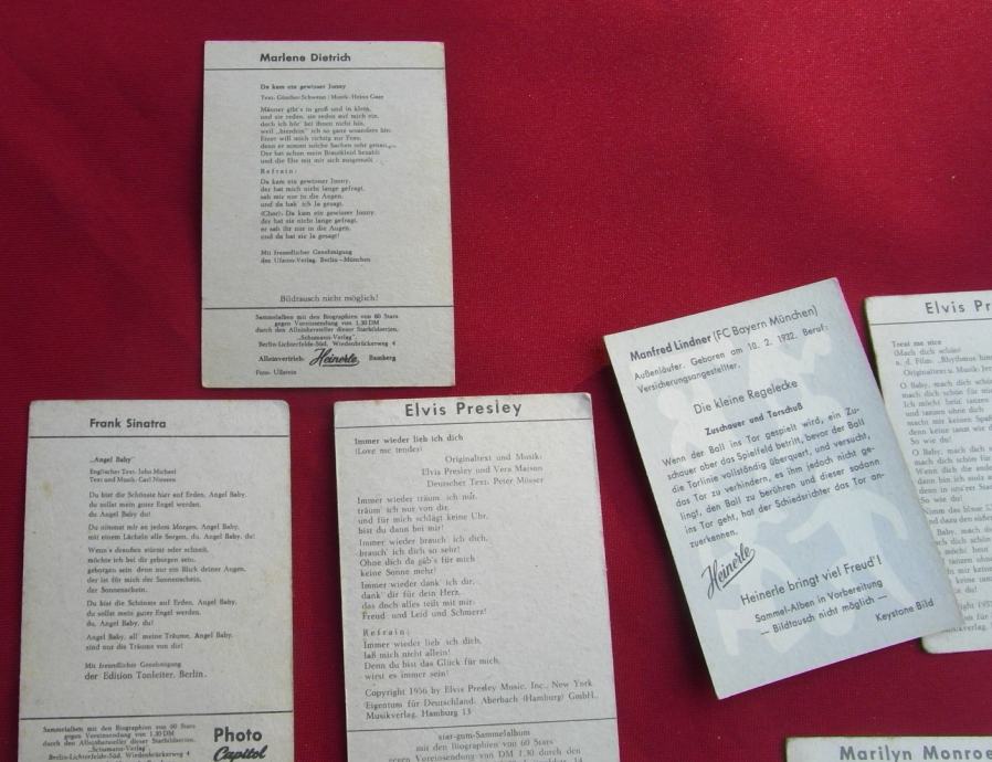 Sličice iz čokolada Heinerle i žvakača Star. U lotu je 122 sličice,od čega ima 30- ak duplikata. U lotu su sličice Elvisa, Marlene Ditrich , Bayerna i njegovih igrača...