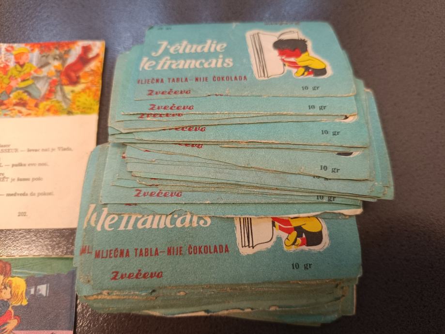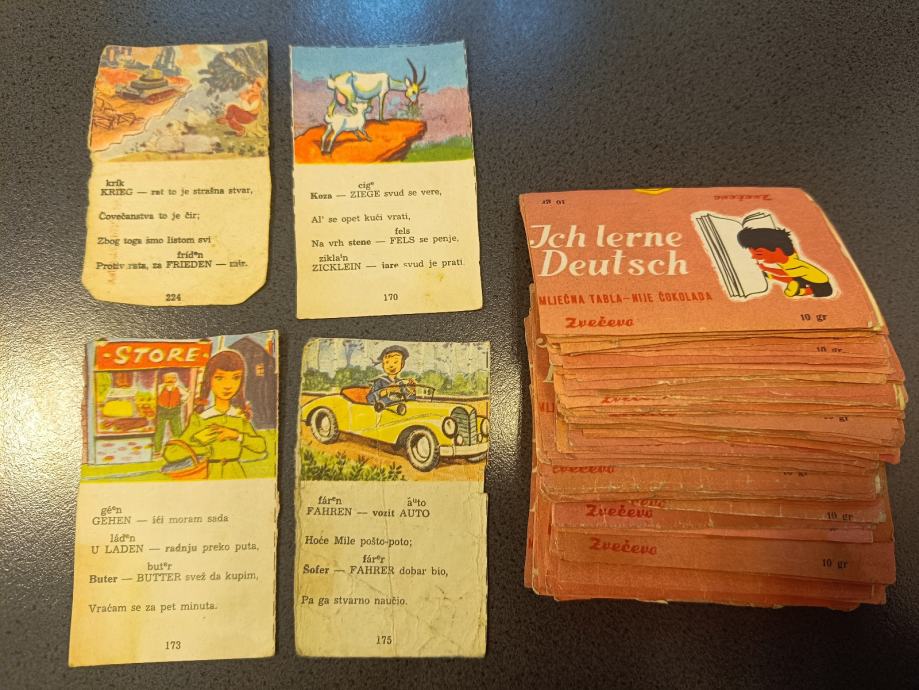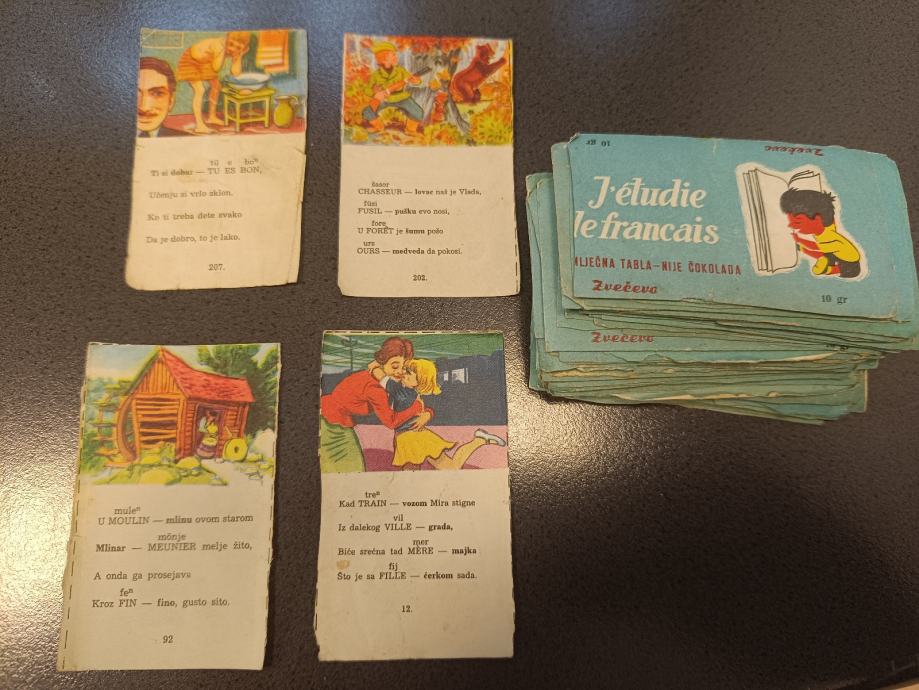 Prodajem 3 seta izrezaka od Zvečevo čokolada iz 1960-ih, s ilustracijama za učenje engleskog, njemačkog i francuskog jezika, koje su se lijepile u albume "Učimo jezike". Jako rijetki kolekcionarski primjerci.