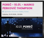 Thompson Poreč 11.01 dvije ulazniceLokacija: Opatija, VoloskoObjavljen: 02.01.2026.Spremi oglasKorisnik nije trgovac80 €