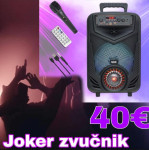 JOKER BLUETOOTH ZVUČNIK + GRATIS MIKROFON + DALJINSKI - NOVO!Lokacija: Trešnjevka - Jug, KnežijaObjavljen: 30.01.2026.Spremi oglasKorisnik nije trgovac40 €