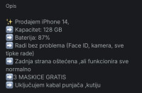 iPhone 14, crne boje, 256 GBLokacija: Samobor, Južno naseljeObjavljen: 07.02.2026.Spremi oglasKorisnik nije trgovac400 €