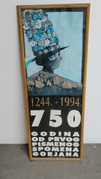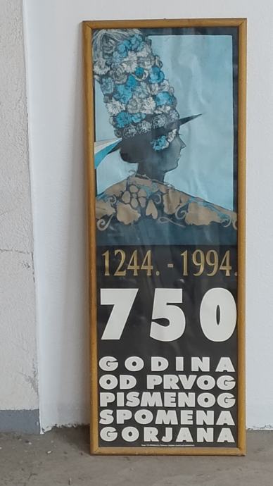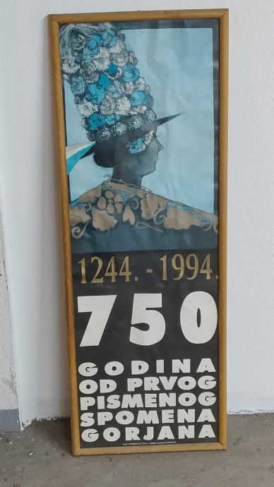 750 godina Gorjana, plakat povodom 750 godina spomena slavonskih Gorjana, uramljen i ustakljen. Dimenzije sa okvirom: 100,5 x 36,5 cm , Okvir: 2,0 x 1,6 cm.