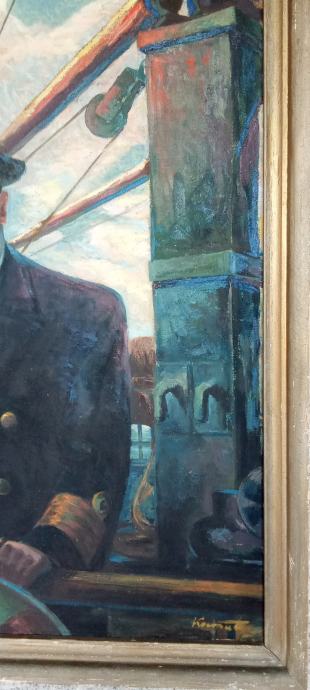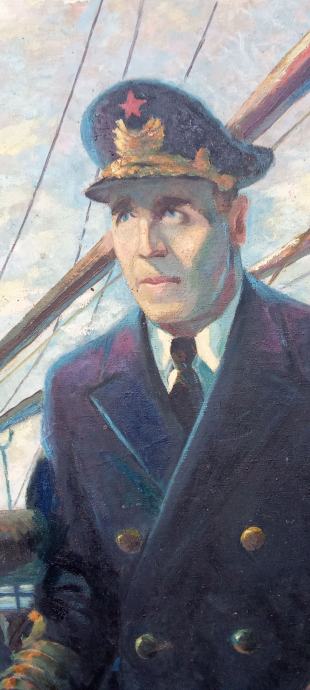 Ulje na platnu, veličina same slike je 70 x 85 cm.potpis autora vidljiv je u donjem desnom kutu.Potpis je čirilićni ali ja ne mogu odgonetnuti o kojem slikaru je riječ,popis polazi slovima Ko •••.Portret prikazuje admirala JRM,slika je dobro očuvana i moje mišljenje je da je stara nekih 60-70 godina.Slika nema nikakvih posebnih oštećenja, uokvirena je u jednu stariju drvenu ramu veličine 80 x 95 cm.ali nisam siguran dali je pripadala ovoj slici.Okvir slike je donekle oštećen,što je i vidljivo iz priloženih fotografija.Moje mišljenje je da je sliku morao oslikati nadaren i obrazovan umjetnik ali kao što sam rekao za mene do danas je ovo rad nepoznatog autora.Tražena cijena mislim da je i više nego korektna kad gledamo očuvanost,veličinu, tehniku izvođenja i sve drugo.S druge strane slike na blind rami vidljiv je neki pečat koji nije kompletan, potpuno isti materijal su nekad davno koristili poštari u poštanskim uredima kada bi koristili isti taj materijal kod pečatiranja paketa i ostalih pošiljki.