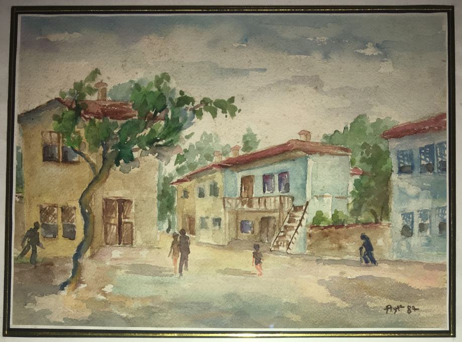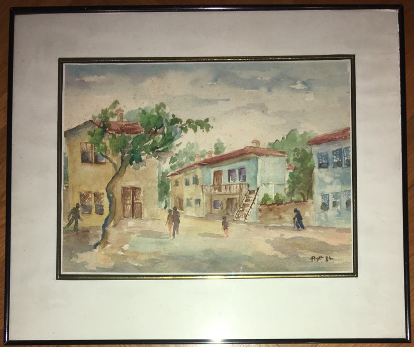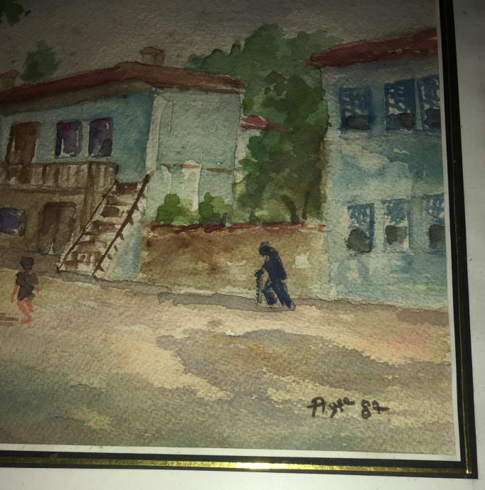 Akvarel iz 1987.g. meni nepoznatog autora (potpis vidljiv na fotografijama). Uokvireno i ostakljeno. DImenzije s okvirom su 42x36cm (dimenzije unutar paspartua su 31x23cm).