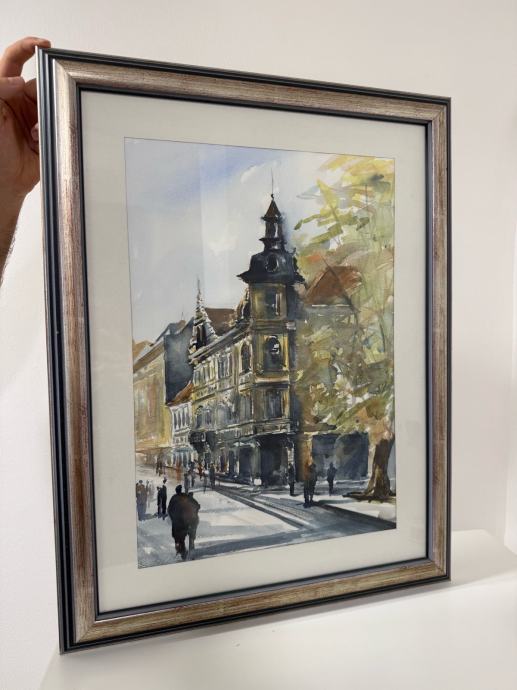 Prodajem umjetničku akvarel sliku s motivom gradske ulice i povijesne arhitekture. Slika je izrađena u profinjenoj akvarel tehnici s naglaskom na igru svjetla i sjene, te prikazuje elegantnu staru zgradu i prolaznike u pokretu.