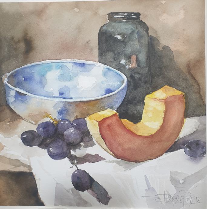 Akvarel 34x33cm, rađen na 100% pamučnom 300 gr akvarel papiru Arches. Slika nije uramljena.