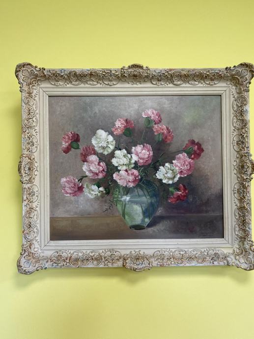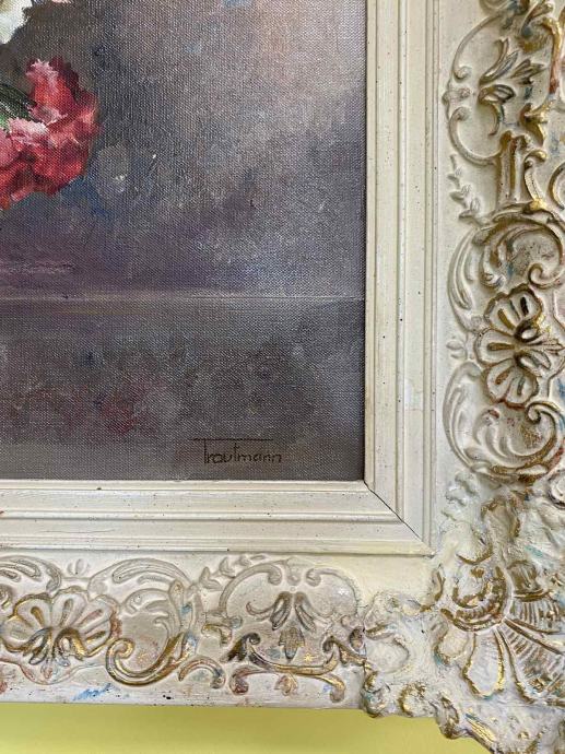 Prodaje se antik slika, ulje na platnu, orginal s potpisom (Trautmann), cvijeće u vazi sa zlatno bijelim okvirom.