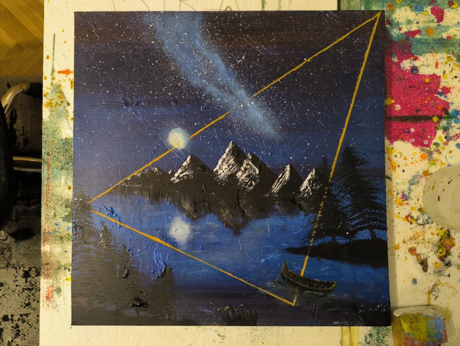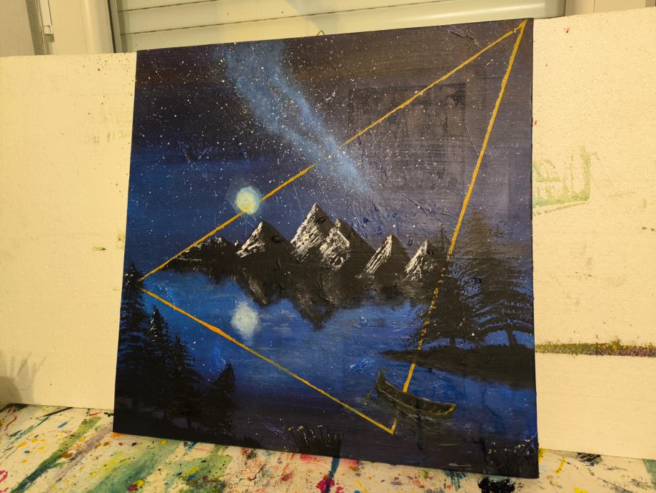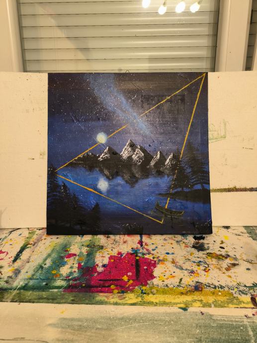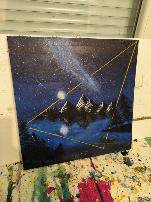 Prodajem apstraktnu akrilnu sliku s motivom planina i jezera sa zvjezdanim nebom, dimenzija 50x50 cm na drvenom okviru. Slika je vlastiti rad.
