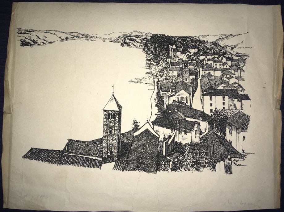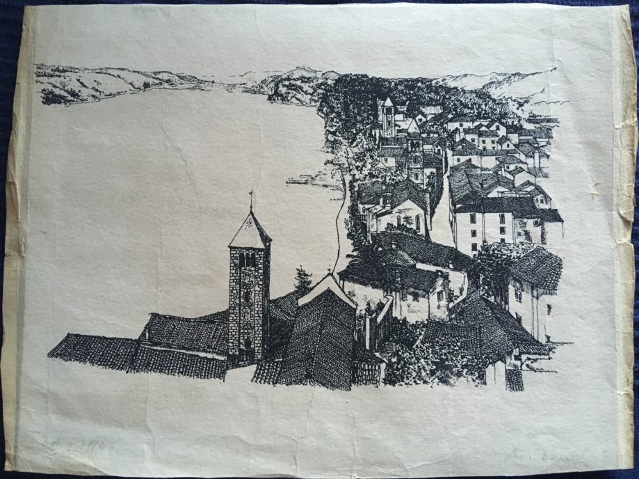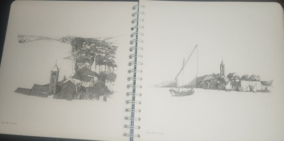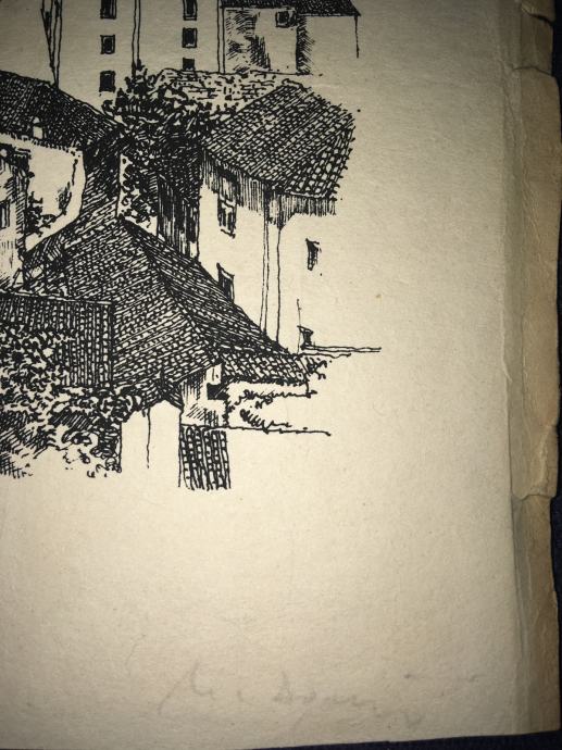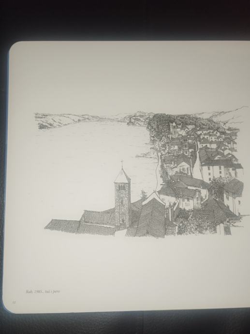 Grafika iz 1986.g. s motivom Raba, slikara, fotografa, konzervatora i povjesničara kulture, Miljenka Domijana. Dimenzije su 27x20cm. Stanje kao na slikama. Uz grafiku ide i knjiga autora u kojoj je ova grafika reproducirana (114 str., tvrdi uvez).