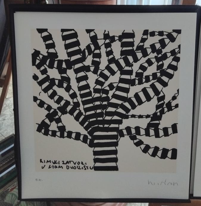 umjetničko djelo prikazuje grafiku "Rimski zatvori u mom dvorištu" autora Borisa Bućana. Djelo je prepoznatljivo po apstraktnom prikazu drveta ili strukture koja podsjeća na rešetke, koristeći crno-bijele pruge za stvaranje iluzije dubine i volumena.